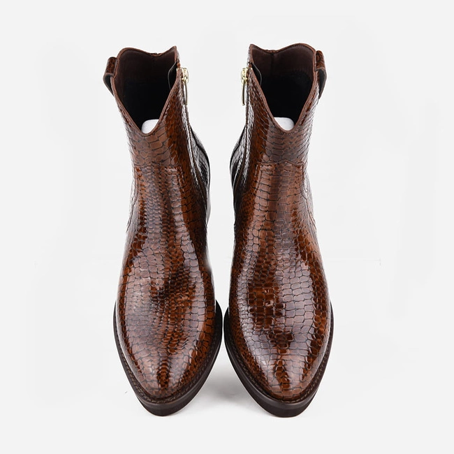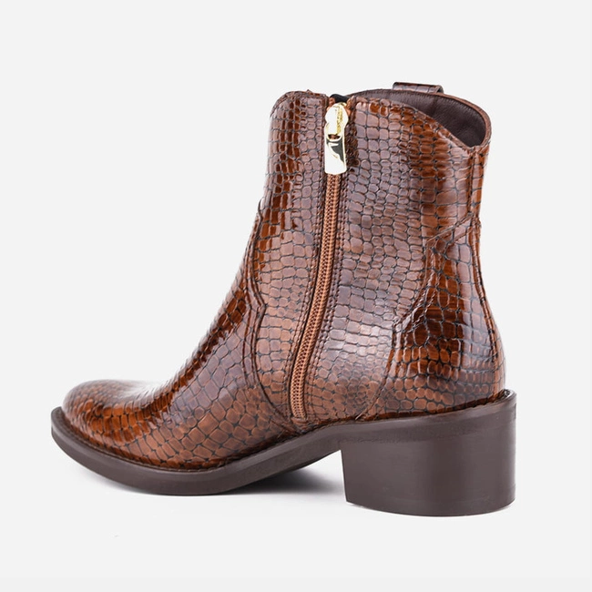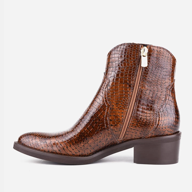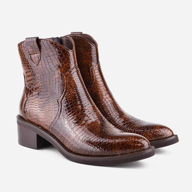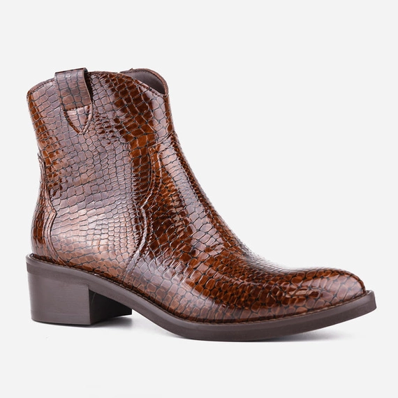 PIĘKNE LAKIEROWANE BOTKI Z NATURALNEJ SKÓRY IMITUJĄCEJ KROKODYLA. BUTY ZAPINANE NA ZAMEK, DZIĘKI CZEMU ŁATWO SIĘ JE ZAKŁADA. FASON KOWBOJEK Z WĄSKIM NOSKIEM. WYGODNY 5CM OBCAS.